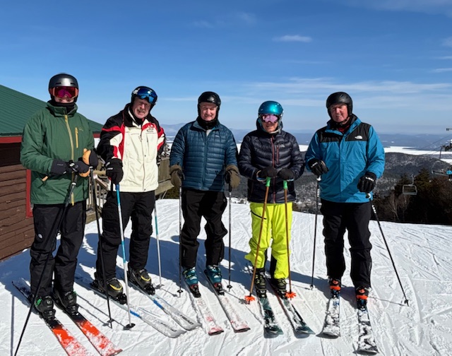 2025-2026 Annual Skimeister event. Left to Right, Rob Roy MacGregor, Geoff Simpson, Keith Simpson, Ira Colby, Jeff Ballentine John Risley took the picture atop Gunstock overlooking Lake Winnipesaukee.